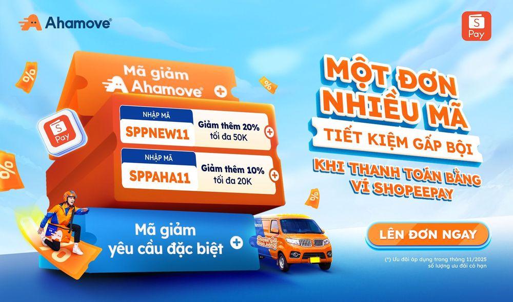 Từ ngày 10/11 đến hết ngày 30/11/2025, Ahamove chính thức bắt tay cùng ShopeePay ra mắt chương trình ưu đãi “Một deal nhiều mã - tiết kiệm gấp bội” – cho phép người dùng kết hợp nhiều mã giảm giá cùng lúc trong một đơn hàng.