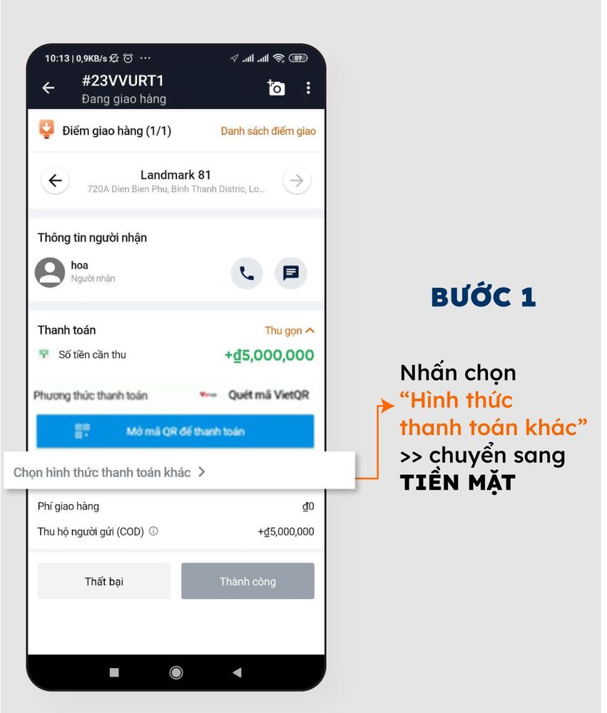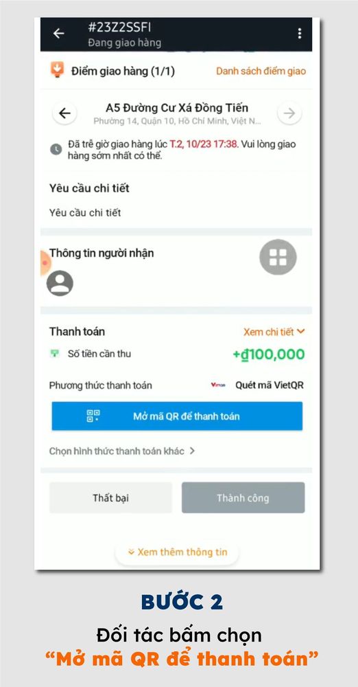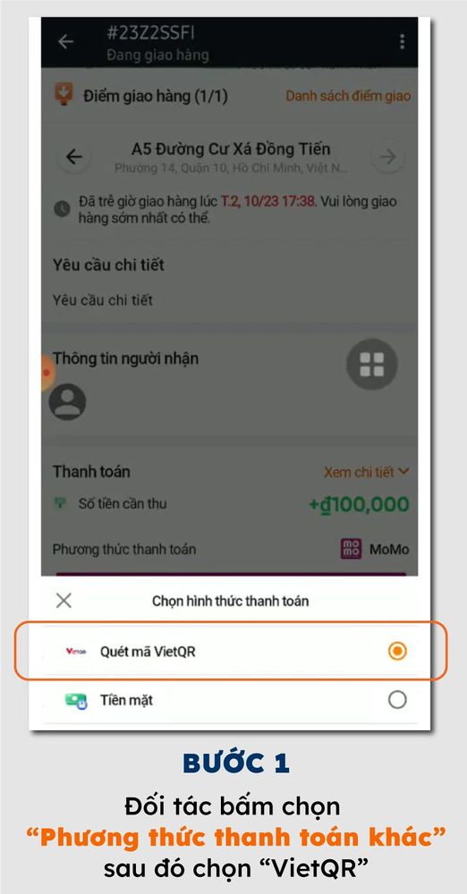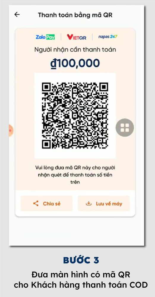 - Thu hộ tiền COD bằng 2 cách: Cho Khách hàng quét mã QR code VietQR HOẶC THU TIỀN MẶT từ Khách hàng