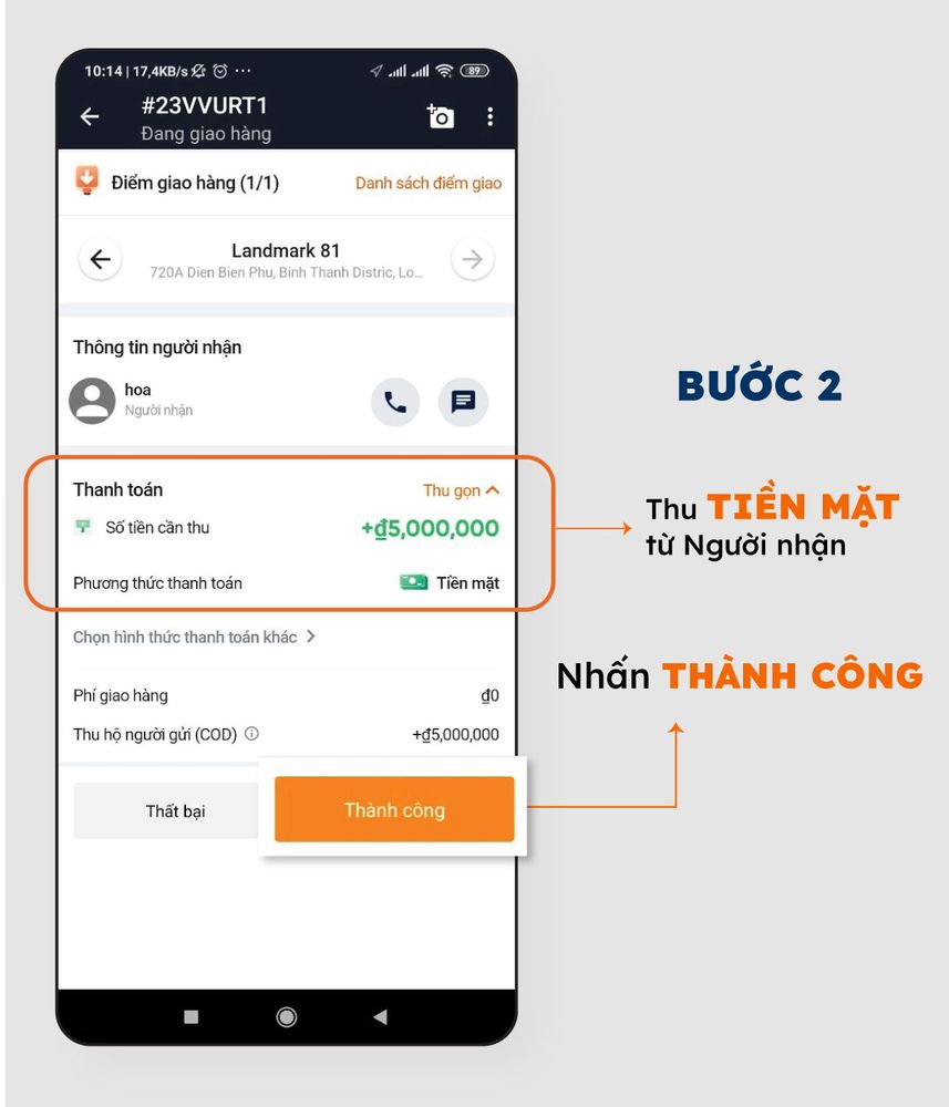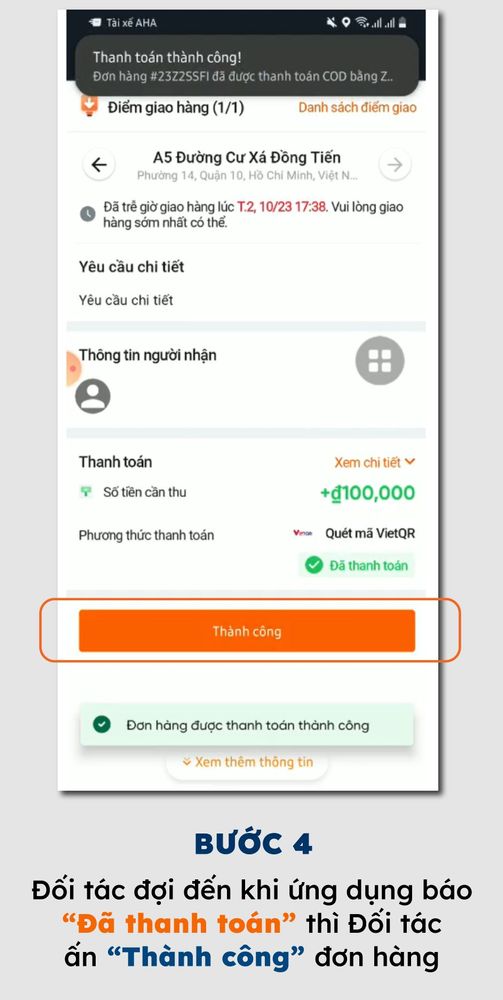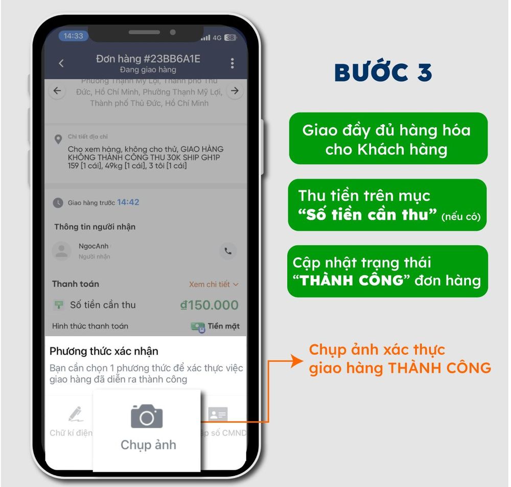 Bước 3: Giao hàng, Thu tiền (nếu có) >> Xác nhận “THÀNH CÔNG”, chụp ảnh xác thực giao hàng và nộp lại tiền thu hộ COD (nếu có yêu cầu)