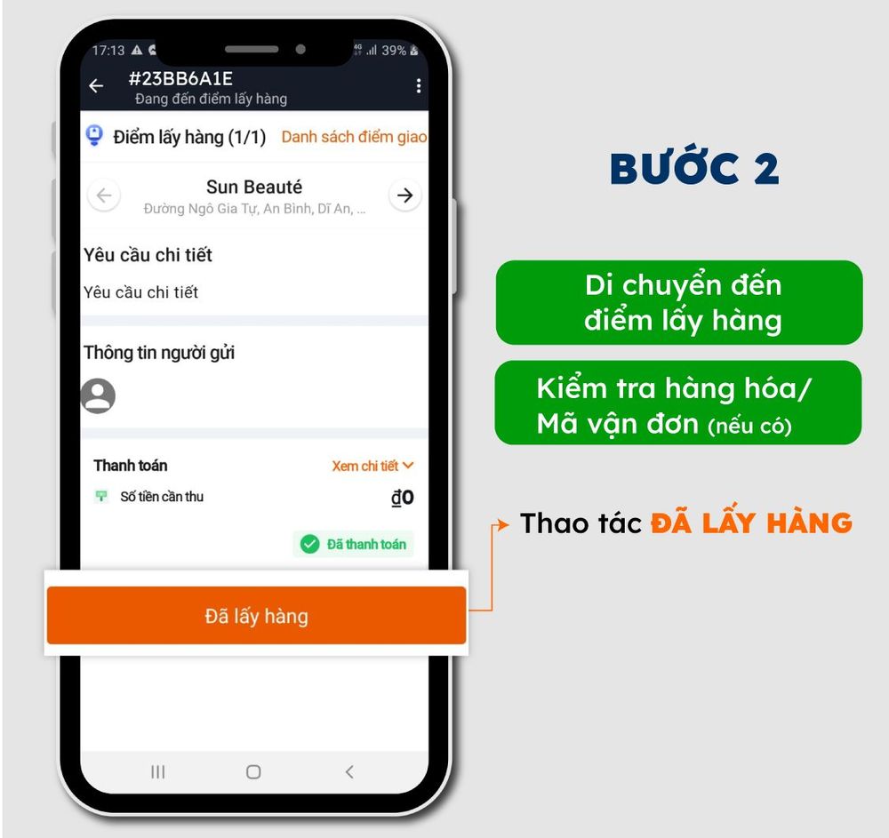 Bước 2: Lấy hàng, kiểm tra hàng hóa, Mã vận đơn >> Xác nhận “ĐÃ LẤY HÀNG”