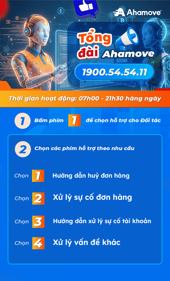Theo đó, Ahamove sẽ ngưng hỗ trợ nhánh Sự cố tài khoản qua Tổng đài 1900.54.54.11. Việc áp dụng AI sẽ giúp Đối tác giải quyết các vấn đề liên quan đến tài khoản (khóa/mở, cập nhật thông tin...) một cách tức thời mà không cần chờ đợi kết nối với tổng đài viên.