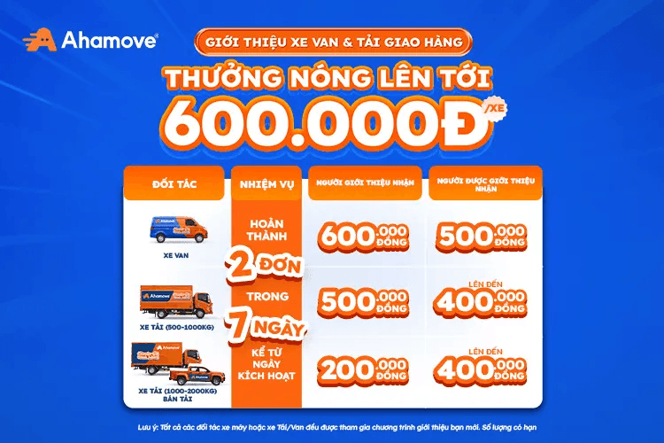 Nhận thưởng ngay 500,000 vnđ khi giới thiệu thành công 01 bạn mới đăng ký trở thành Tài xế giao hàng của Ahamove.