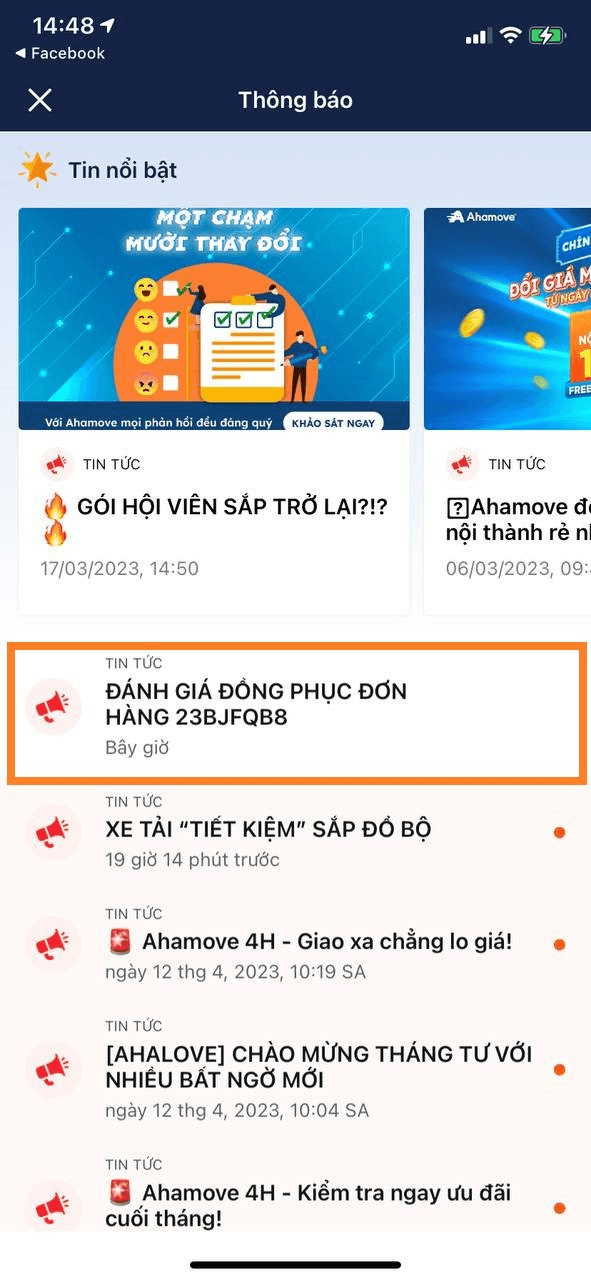 Bước 2: Vào Thông báo → Link đánh giá đơn hàng bạn đặt sẽ được gửi trong 15 phút kể từ khi bạn đặt đơn trên ứng dụng -> Chọn đúng link đơn hàng bạn muốn đánh giá