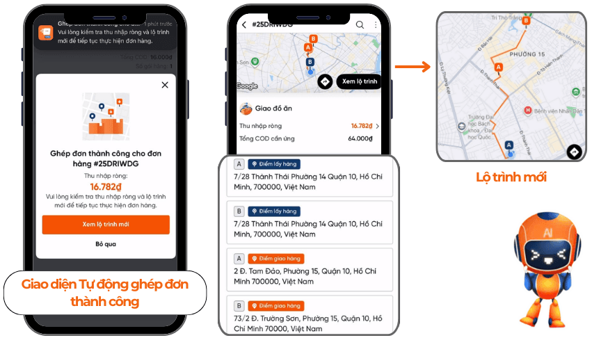 - Đơn được tự động ghép sẽ đảm bảo cùng tuyến đường, được tối ưu lại quãng đường và được hệ thống tự động tính lại cước phí.