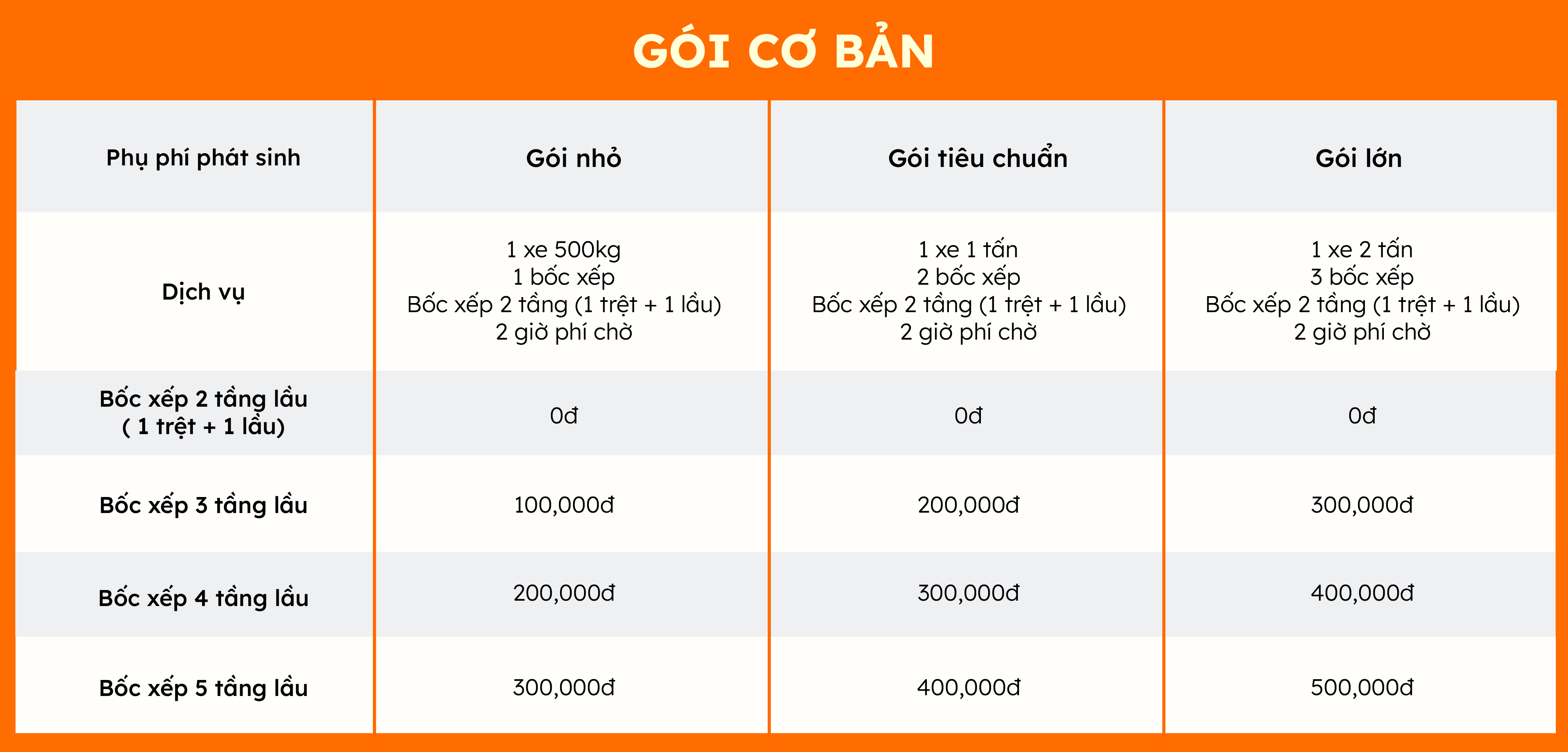 | Dịch vụ bao gồm: | 1 Xe 500 Kg 1 người bốc xếp Bốc xếp 2 tầng (1 trệt + 1 lầu) 2 giờ phí chờ | 1 Xe 1 Tấn 2 người bốc xếp Bốc xếp 2 tầng (1 trệt + 1 lầu) 2 giờ phí chờ | 1 Xe 2 Tấn 2 - 3 người bốc xếp Bốc xếp 2 tầng (1 trệt + 1 lầu) 2 giờ phí chờ |