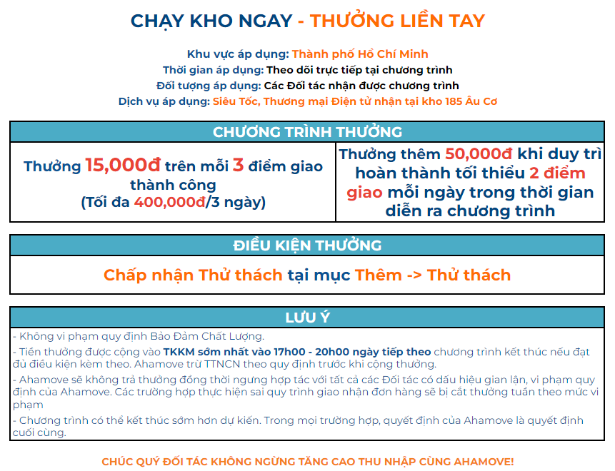 HOT: 30,000 đơn hàng sắp đổ bộ trên ứng dụng của đối tác từ 11 - 15.11 sắp tới (cuối tuần này). Hãy chuẩn bị chiến đơn ngay bởi Ahamove sẽ đặc biệt chiêu đãi "THƯỞNG 3 MÓN TẠI KHO" cho tất cả bác tài ghé Kho!