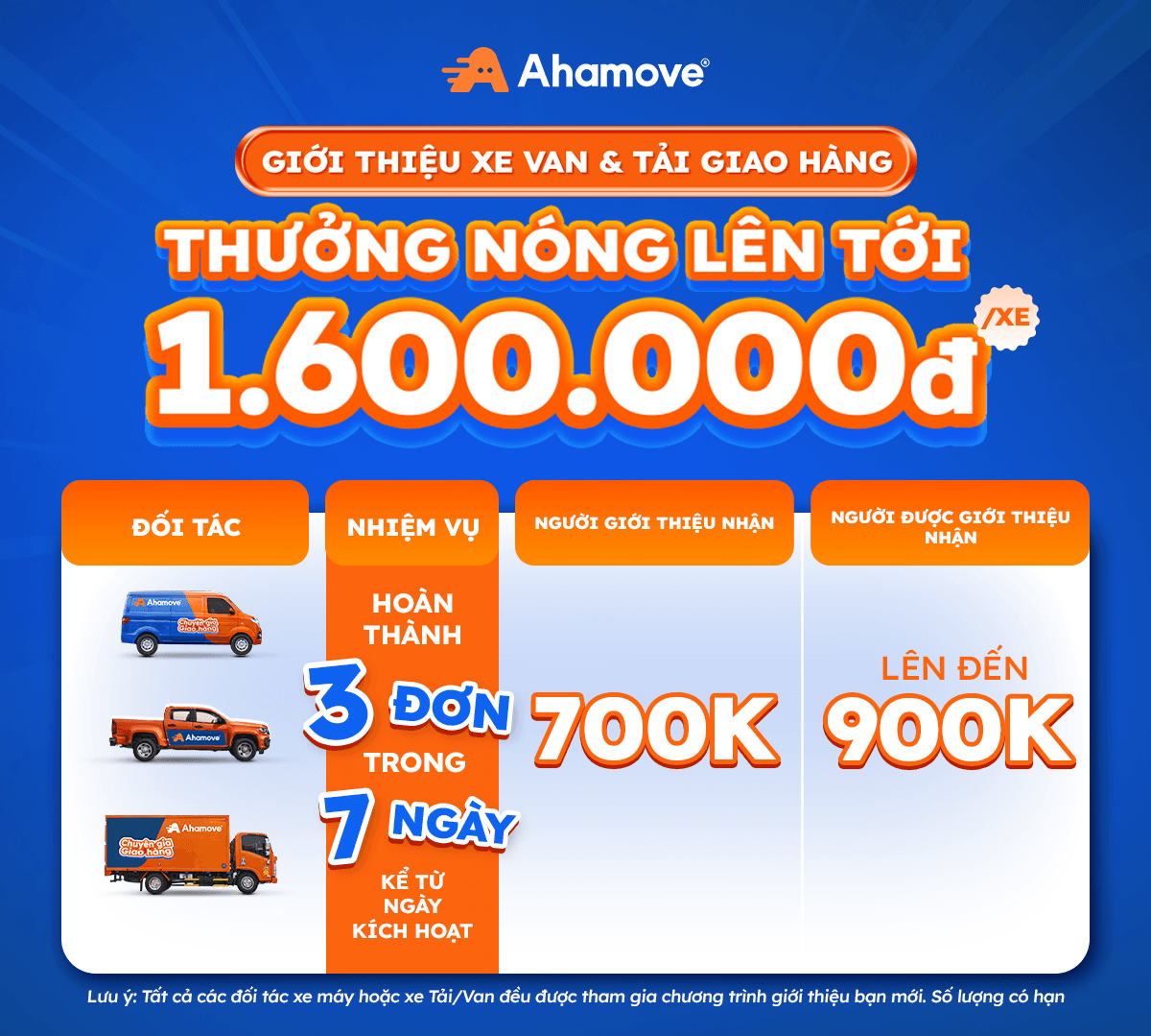 NHẬN NGAY 700,000Đ KHI GIỚI THIỆU THÀNH CÔNG 01 ĐỐI TÁC XE BỐN BÁNH ĐĂNG KÝ AHAMOVE