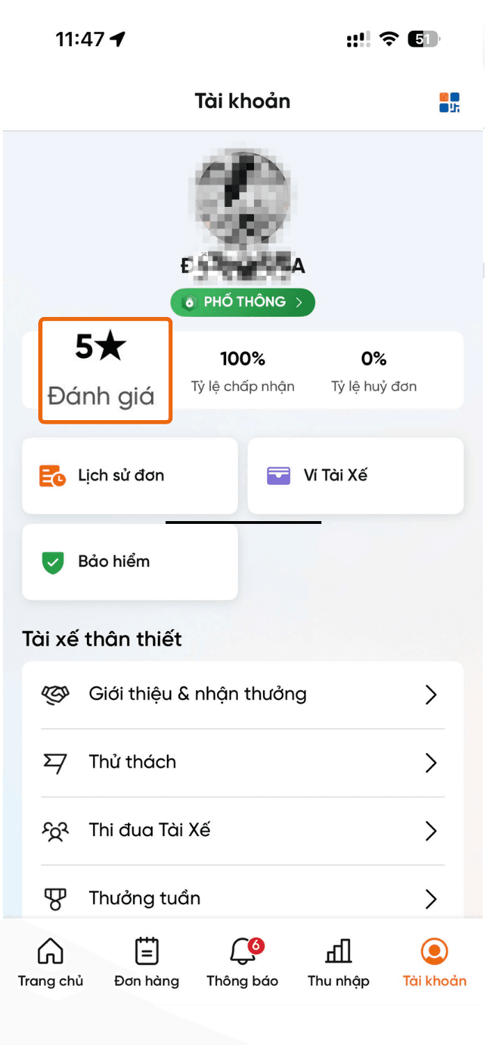 Để kiểm tra mức Đánh giá sao, Đối tác truy cập vào mục Tài khoản trên ứng dụng Tài xế Aha.