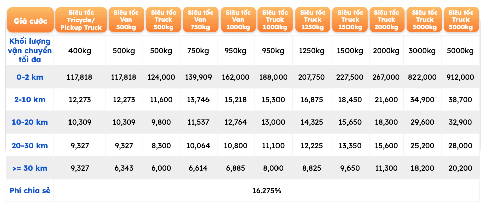 4. Bảng giá Dịch vụ SIÊU TỐC - Xe 3/4 bánh