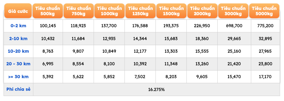 5. Bảng giá dịch vụ TIÊU CHUẨN 500kg - 5000kg