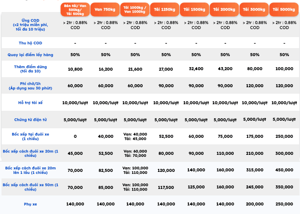 *Lưu ý: Bảng giá chưa bao gồm các phi phí phát sinh như phí cầu đường, chành xe,…