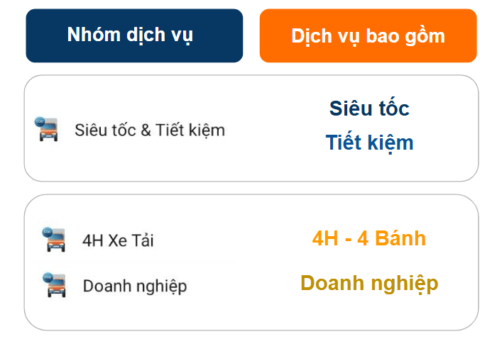- Nhóm dịch vụ là hình thức phân loại các dịch vụ có điểm chung về thời gian giao - nhận hàng, hỗ trợ Đối tác tìm chọn những đơn hàng phù hợp và nâng cao hiệu suất hoạt động.