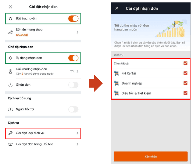 - Thời gian áp dụng: Ahamove đã cập nhật hình thức này trên ứng dụng Tài xế từ tháng 04/2025. Đối tác có thể tìm chọn Nhóm dịch vụ tại phần Cài đặt nhận đơn (như hướng dẫn trong hình)