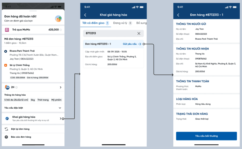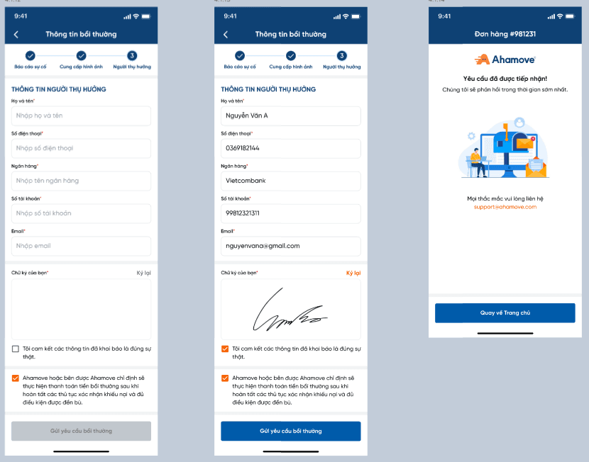 - Cơ chế bồi thường minh bạch: Dựa trên hóa đơn, chứng từ hợp lệ và giá trị khai báo, Ahamove sẽ thực hiện bồi thường lên tới 100% giá trị tổn thất.