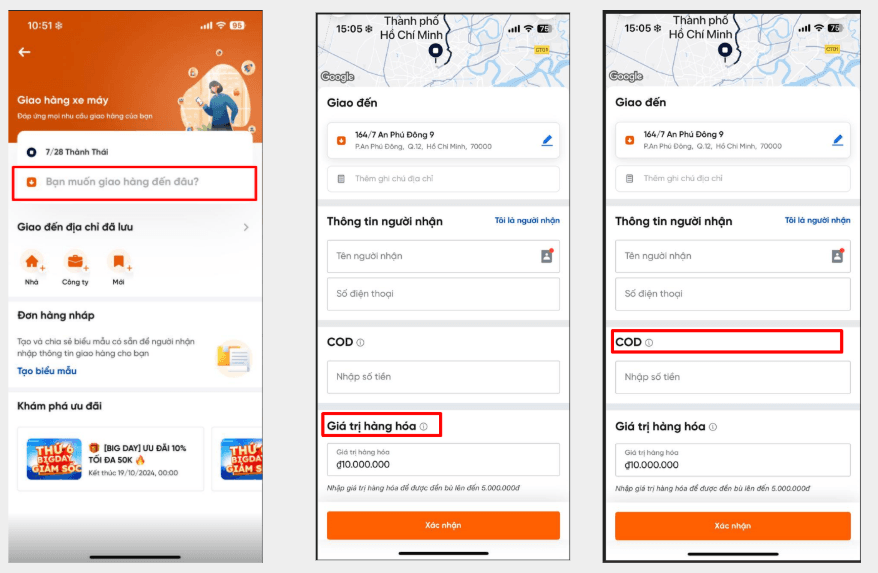 Bước 2: Tại màn hình “Giao đến”, Khách hàng khai báo thông tin giá trị hàng hóa cần giao tại mục “Giá trị hàng hóa” để sử dụng dịch vụ và đảm bảo quyền lợi của khách hàng. Phí khai giá sẽ được tính tự động dựa trên thông tin Khách hàng điền vào mục “Giá trị hàng hóa”