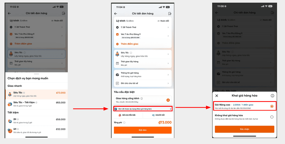 Bước 4: Tiến hành xác nhận và lựa chọn dịch vụ phù hợp, nhập thông tin gói hàng để lưu ý cho tài xế. “Phí khai giá” sẽ được tính tại mục Yêu cầu đặc biệt và tính vào tổng phí đơn hàng